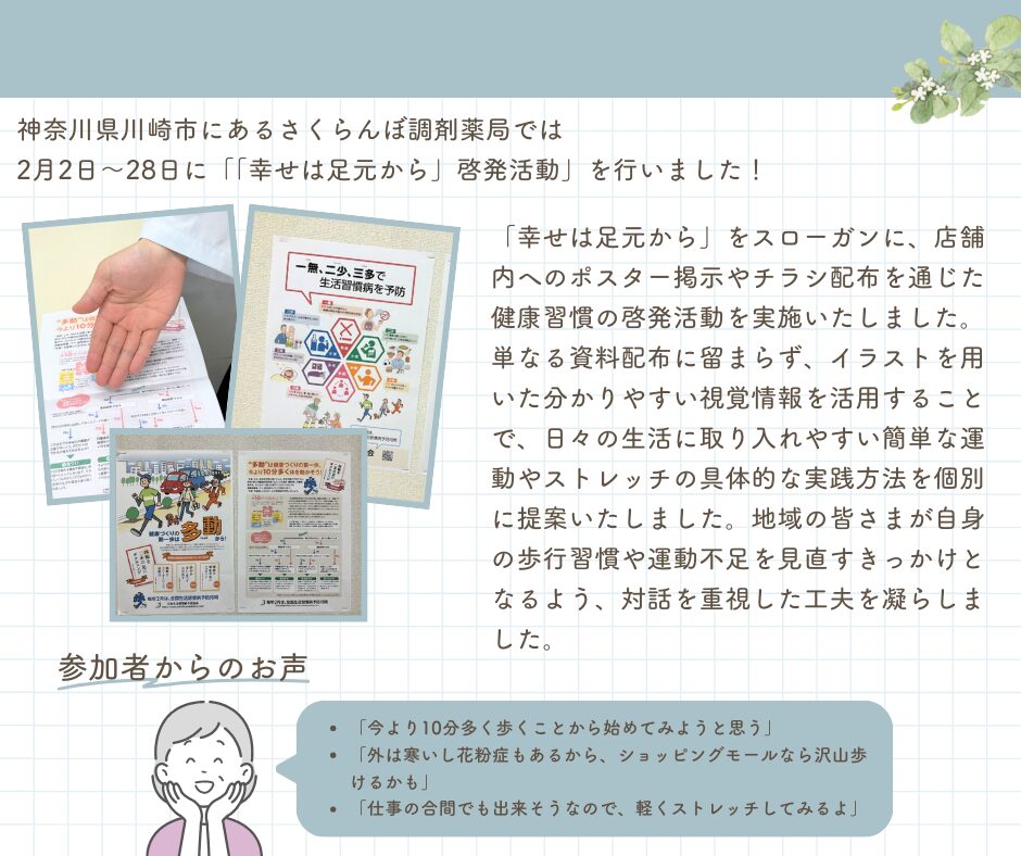 《地域イベントレポート》 さくらんぼ調剤薬局 「幸せは足元から」啓発活動の実施